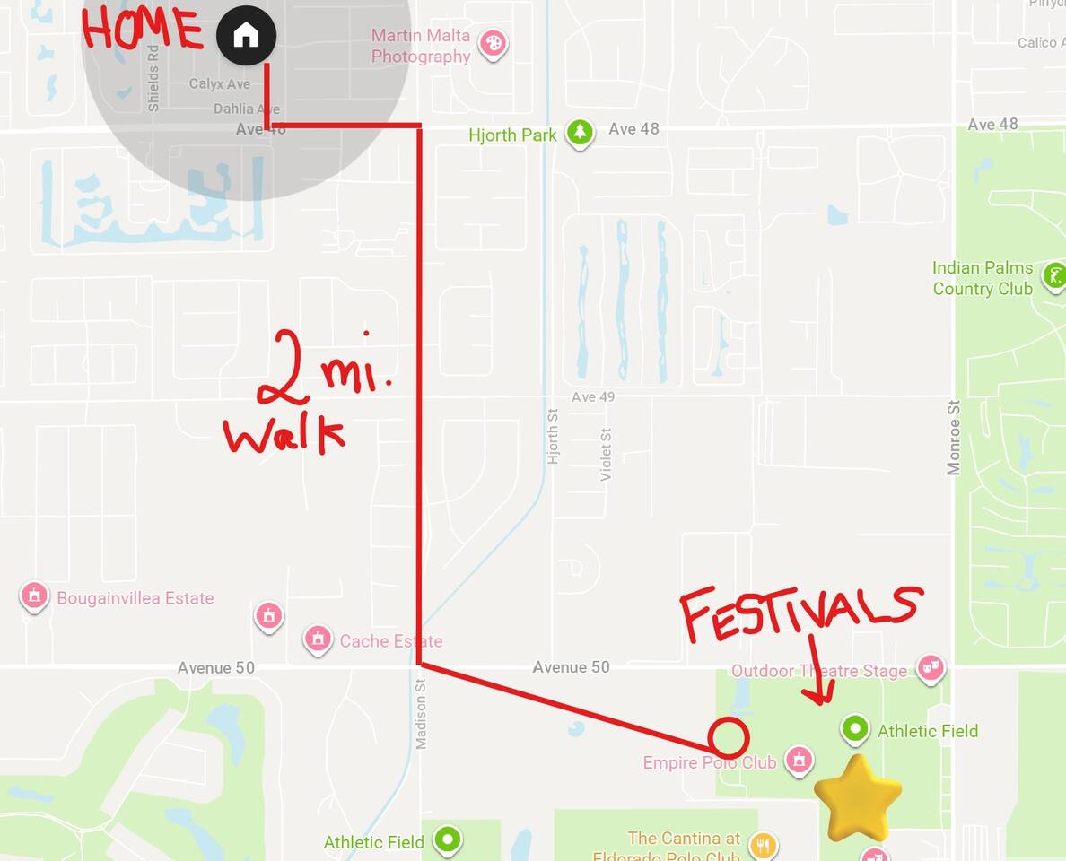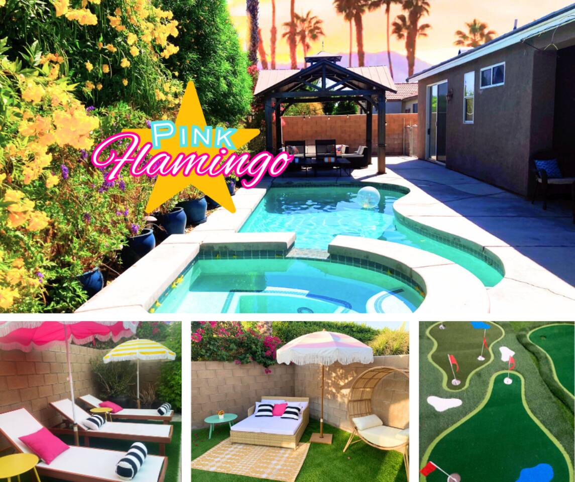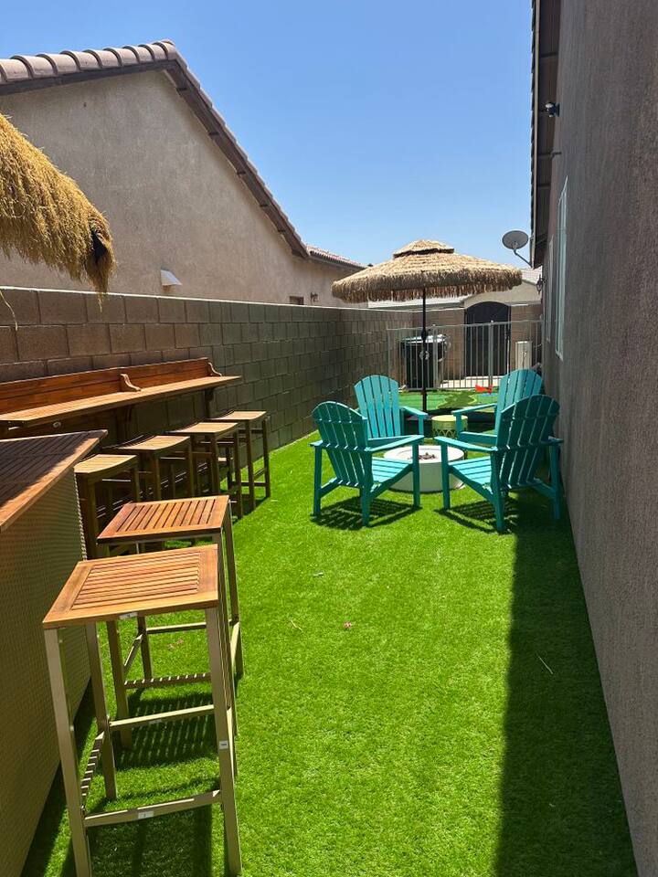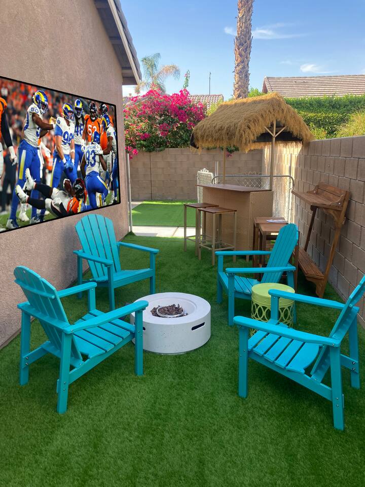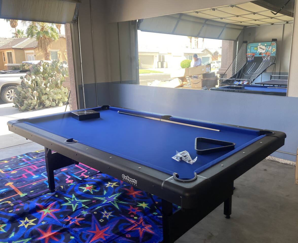Tiki Boho is a Family friendly 4 Bedroom Villa - Sleeps 16 - located on border of La Quinta and Indio. Watch your favorite NFL Football Teams this season on our OUTDOOR FOOTBALL JUMBO SCREEN or entertain the kiddos with their favorite Disney+ shows while lounging in the Heated Pool and Spa! Mini Golf 12 holes and Tiki Bar with chairs and fire pit! Full Arcade with Legal size pool table, ping pong, hockey, foosball, roller ball, and Neon Theme! Enjoy with your family & friends located central to everything. Shops, Restaurants, Art fairs, Safari Park, Concerts, & Golf! Explore around Old Town La Quinta, visit hiking trails, take a drive to Joshua Tree and enjoy nature and trails. ALL BEDROOMS: 16 Capacity Bedroom 1: 2 Queen beds (4 people) and a trundle bed (2 people) - Very large room sleeps 6 Bedroom 2: Queen bed - sleeps 2 Bedroom 3: 1 Double Full bed/sleeps 2 - 1 Bunk Bed Twin Size/sleeps 2 Bedroom 4: Master Bedroom - 1 King bed/sleeps 2 - 1 Trundle Bed/sleeps 2 - 1 Crib Pack and Play IF NEEDED IN CLOSET: 1 Extra Twin Size Trundle with Mattress sleeps 1 TWO OUTDOOR LED TV JUMBO SCREEN AND PROJECTOR: We have 2 large 8x5 foot screens in the pool area and tiki bar area to enjoy with friends and family watching your favorite NFL Football teams, Baseball, Soccer, Tennis, Golf, and Hockey. Have the kids enjoy their favorite movies on Disney+ - YOU MUST HAVE YOUR OWN APP ACCOUNTS OR FIRE STICK 1. Projector has Netflix, Prime video, Disney+, YouTube, Hulu, and other apps 2. Can use Roku Fire Stick or Chromecast 3. Play Station hookups available on projector 4. High Def, USB and Bluetooth equipped - Please keep sound lower due to neighbors especially in the evening. 5. One Projector 1080P, 4K Projector Full HD with WIFI 6 and Bluetooth 5.2, Support 270° Rotatable 4 SMART TV's in Living Room, Bedroom 1 with 6 people, King Size Bedroom, and Master Bedroom 1GB Fast WIFI IN HOME WHAT ARE THE ACCOMODATIONS? Your vacation rental is completely furnished and well stocked with all major and small appliances, including a coffee maker, Keurig coffee bean grinder, blender, toaster, Crock pot, iron, ironing board, hair dryer... The kitchen is well equipped with all basic dining and serving essentials, including plates, bowls, silverware, cooking and grilling utensils, wine and drinking glasses, bar and wine accessories. If you find yourself in need of something, please contact me so I can accommodate your request. HOUSE SUPPLIES Your home will be stocked with an initial supply of trash bags, paper towels, toilet paper, kitchen cleaning supplies, laundry detergent, basic cooking spices, hand soap, his & her body wash, and shampoo & conditioner. Other items include pool towels for all guests. TRANSPORTATION Your vacation home is central to many attractions, including walking distance to Coachella Fairgrounds & Stagecoach, Polo fields, and biking distance to Old Town La Quinta. Included are four easy riding beach cruiser bicycles equipped with lights, helmets and locks, if you choose to take a stroll. Of course any ride share service (Uber & Lyft) and traditional transit services (Taxi & Bus) are always available too. If you drove or rented a car, you may park 2 car(s) in the garage and 2 in the driveway. Street parking is strictly monitored and enforced to 2 cars. If you plan on attending the music festivals, there is a shuttle service close by, or you may opt to rent bikes or use a ride share service. LOCATION Minutes from the Coachella Festivals, Indian Wells Tennis Gardens, Empire Polo Fields, Old Town La Quinta and many golf courses. Hwy 111 is just down the street 2 blocks with Costco, Target, Starbucks, Coffee Bean & Tea, Super Walmart, and many other chain and local stores. Dining options are abundant and close. Just minutes from I-10, you can quickly head to Palm Springs and many valley casinos and other Coachella Valley destinations. ESTIMATED DISTANCE FROM YOUR VACATION HOME •Coachella Festivals - 2 miles (2-3 Minutes Driving) •Indian Wells Tennis Garden: 2 miles (2-3 minutes Driving) •Empire Polo Fields: 4 miles (2-3 minutes Driving) •Old Town La Quinta: 4.4 miles (5 minutes Driving) •Palm Springs International Airport: 19 miles (24 minutes Driving) •Joshua Tree National Park: 55 miles (53 minutes Driving) LOCAL ORDINANCE / GOOD NEIGHBOR POLICY I encourage you to enjoy my property; however, if there is a noise complaint and the sheriff responds you will receive a fine from $500-$5000 from the City of Indio, followed by a possible eviction in egregious circumstances. Guests will not be issued a refund for issues related to a noise ordinance violation. It is important to respect the quiet enjoyment of neighbors. There is a mandatory 10% City of Indio Transient Occupancy Tax (TOT) added to your stay, which may have been collected at time of reservation. GUEST ACCESS You will have full access to the entire house and backyard with extreme privacy! CHILDREN & POOL NOTE: There is no lifeguard on site and there is no safety pool fence around pool. There are two exterior access doors equipped with door breach alarms connected to the house alarm that will chime every time the doors are opened (back patio door & master bedroom slider). WALK WALK TO COACHELLA AND STAGECOACH: A short 9 min walk to Festivals or bike ride. Guests have read and understand that their children(s) safety is their priority and they are responsible for proper adult supervision. There is no diving allowed into the pool or spa. This pool is only 5-6 feet in depth and diving is extremely dangerous and could lead to serious injury or death. House Rules: Please follow our rules and respect the home 1. No smoking of cigarettes, vape, weed or any other drugs inside home. Any smoking products or smell will be a fine to guests for disobeying house rules. 2. No glass around pool or in pool. Broken glass found will be fined. 3. No graffiti in back yard or pool - $500 fine 4. Quiet hours in home and outside on backyard/patios - Must b