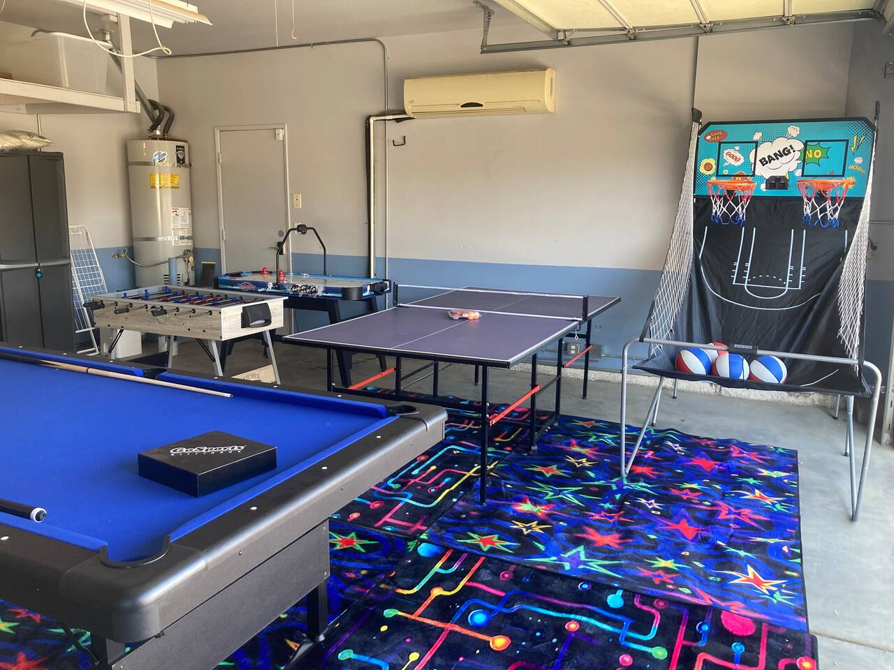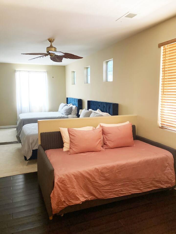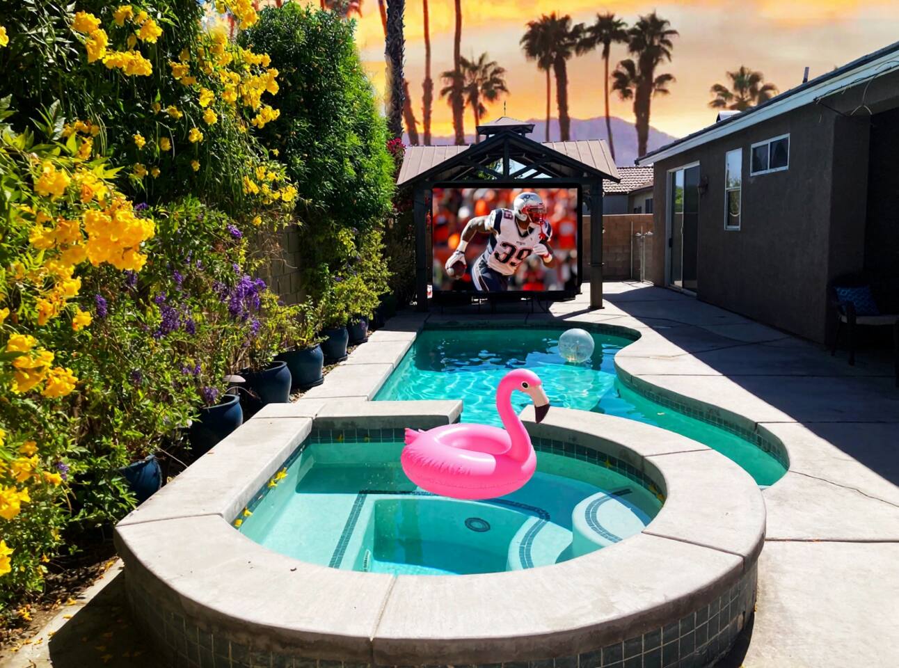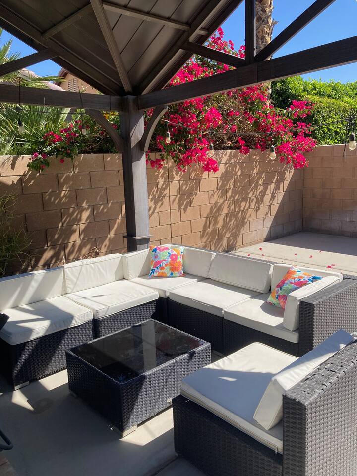 Tiki Boho is a Family friendly 4 Bedroom Villa - Sleeps 16 - located on border of La Quinta and Indio. Watch your favorite NFL Football Teams this season on our OUTDOOR FOOTBALL JUMBO SCREEN or entertain the kiddos with their favorite Disney+ shows while lounging in the Heated Pool and Spa! Mini Golf 12 holes and Tiki Bar with chairs and fire pit! Full Arcade with Legal size pool table, ping pong, hockey, foosball, roller ball, and Neon Theme! Enjoy with your family & friends located central to everything. Shops, Restaurants, Art fairs, Safari Park, Concerts, & Golf! Explore around Old Town La Quinta, visit hiking trails, take a drive to Joshua Tree and enjoy nature and trails. ALL BEDROOMS: 16 Capacity Bedroom 1: 2 Queen beds (4 people) and a trundle bed (2 people) - Very large room sleeps 6 Bedroom 2: Queen bed - sleeps 2 Bedroom 3: 1 Double Full bed/sleeps 2 - 1 Bunk Bed Twin Size/sleeps 2 Bedroom 4: Master Bedroom - 1 King bed/sleeps 2 - 1 Trundle Bed/sleeps 2 - 1 Crib Pack and Play IF NEEDED IN CLOSET: 1 Extra Twin Size Trundle with Mattress sleeps 1 TWO OUTDOOR LED TV JUMBO SCREEN AND PROJECTOR: We have 2 large 8x5 foot screens in the pool area and tiki bar area to enjoy with friends and family watching your favorite NFL Football teams, Baseball, Soccer, Tennis, Golf, and Hockey. Have the kids enjoy their favorite movies on Disney+ - YOU MUST HAVE YOUR OWN APP ACCOUNTS OR FIRE STICK 1. Projector has Netflix, Prime video, Disney+, YouTube, Hulu, and other apps 2. Can use Roku Fire Stick or Chromecast 3. Play Station hookups available on projector 4. High Def, USB and Bluetooth equipped - Please keep sound lower due to neighbors especially in the evening. 5. One Projector 1080P, 4K Projector Full HD with WIFI 6 and Bluetooth 5.2, Support 270° Rotatable 4 SMART TV's in Living Room, Bedroom 1 with 6 people, King Size Bedroom, and Master Bedroom 1GB Fast WIFI IN HOME WHAT ARE THE ACCOMODATIONS? Your vacation rental is completely furnished and well stocked with all major and small appliances, including a coffee maker, Keurig coffee bean grinder, blender, toaster, Crock pot, iron, ironing board, hair dryer... The kitchen is well equipped with all basic dining and serving essentials, including plates, bowls, silverware, cooking and grilling utensils, wine and drinking glasses, bar and wine accessories. If you find yourself in need of something, please contact me so I can accommodate your request. HOUSE SUPPLIES Your home will be stocked with an initial supply of trash bags, paper towels, toilet paper, kitchen cleaning supplies, laundry detergent, basic cooking spices, hand soap, his & her body wash, and shampoo & conditioner. Other items include pool towels for all guests. TRANSPORTATION Your vacation home is central to many attractions, including walking distance to Coachella Fairgrounds & Stagecoach, Polo fields, and biking distance to Old Town La Quinta. Included are four easy riding beach cruiser bicycles equipped with lights, helmets and locks, if you choose to take a stroll. Of course any ride share service (Uber & Lyft) and traditional transit services (Taxi & Bus) are always available too. If you drove or rented a car, you may park 2 car(s) in the garage and 2 in the driveway. Street parking is strictly monitored and enforced to 2 cars. If you plan on attending the music festivals, there is a shuttle service close by, or you may opt to rent bikes or use a ride share service. LOCATION Minutes from the Coachella Festivals, Indian Wells Tennis Gardens, Empire Polo Fields, Old Town La Quinta and many golf courses. Hwy 111 is just down the street 2 blocks with Costco, Target, Starbucks, Coffee Bean & Tea, Super Walmart, and many other chain and local stores. Dining options are abundant and close. Just minutes from I-10, you can quickly head to Palm Springs and many valley casinos and other Coachella Valley destinations. ESTIMATED DISTANCE FROM YOUR VACATION HOME •Coachella Festivals - 2 miles (2-3 Minutes Driving) •Indian Wells Tennis Garden: 2 miles (2-3 minutes Driving) •Empire Polo Fields: 4 miles (2-3 minutes Driving) •Old Town La Quinta: 4.4 miles (5 minutes Driving) •Palm Springs International Airport: 19 miles (24 minutes Driving) •Joshua Tree National Park: 55 miles (53 minutes Driving) LOCAL ORDINANCE / GOOD NEIGHBOR POLICY I encourage you to enjoy my property; however, if there is a noise complaint and the sheriff responds you will receive a fine from $500-$5000 from the City of Indio, followed by a possible eviction in egregious circumstances. Guests will not be issued a refund for issues related to a noise ordinance violation. It is important to respect the quiet enjoyment of neighbors. There is a mandatory 10% City of Indio Transient Occupancy Tax (TOT) added to your stay, which may have been collected at time of reservation. GUEST ACCESS You will have full access to the entire house and backyard with extreme privacy! CHILDREN & POOL NOTE: There is no lifeguard on site and there is no safety pool fence around pool. There are two exterior access doors equipped with door breach alarms connected to the house alarm that will chime every time the doors are opened (back patio door & master bedroom slider). WALK WALK TO COACHELLA AND STAGECOACH: A short 9 min walk to Festivals or bike ride. Guests have read and understand that their children(s) safety is their priority and they are responsible for proper adult supervision. There is no diving allowed into the pool or spa. This pool is only 5-6 feet in depth and diving is extremely dangerous and could lead to serious injury or death. House Rules: Please follow our rules and respect the home 1. No smoking of cigarettes, vape, weed or any other drugs inside home. Any smoking products or smell will be a fine to guests for disobeying house rules. 2. No glass around pool or in pool. Broken glass found will be fined. 3. No graffiti in back yard or pool - $500 fine 4. Quiet hours in home and outside on backyard/patios - Must b