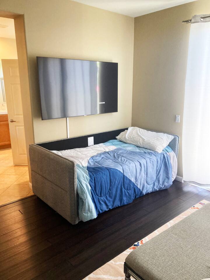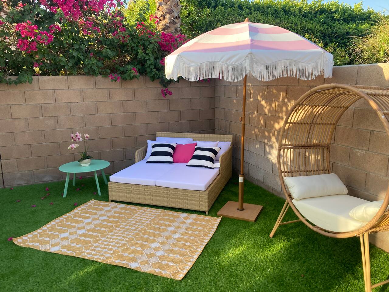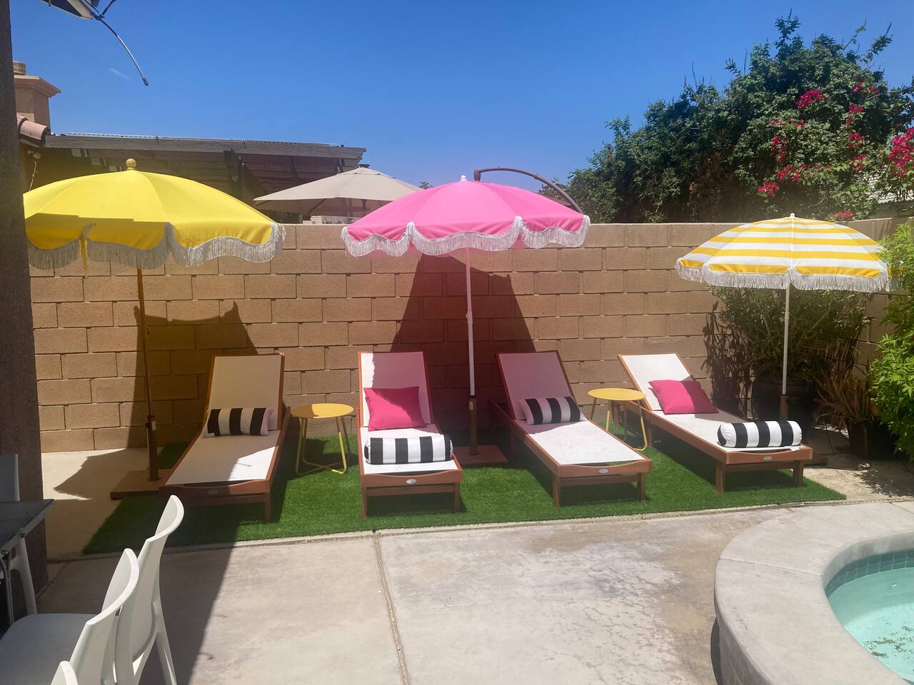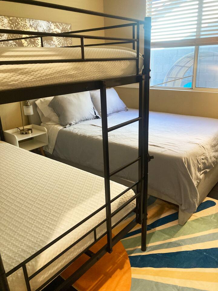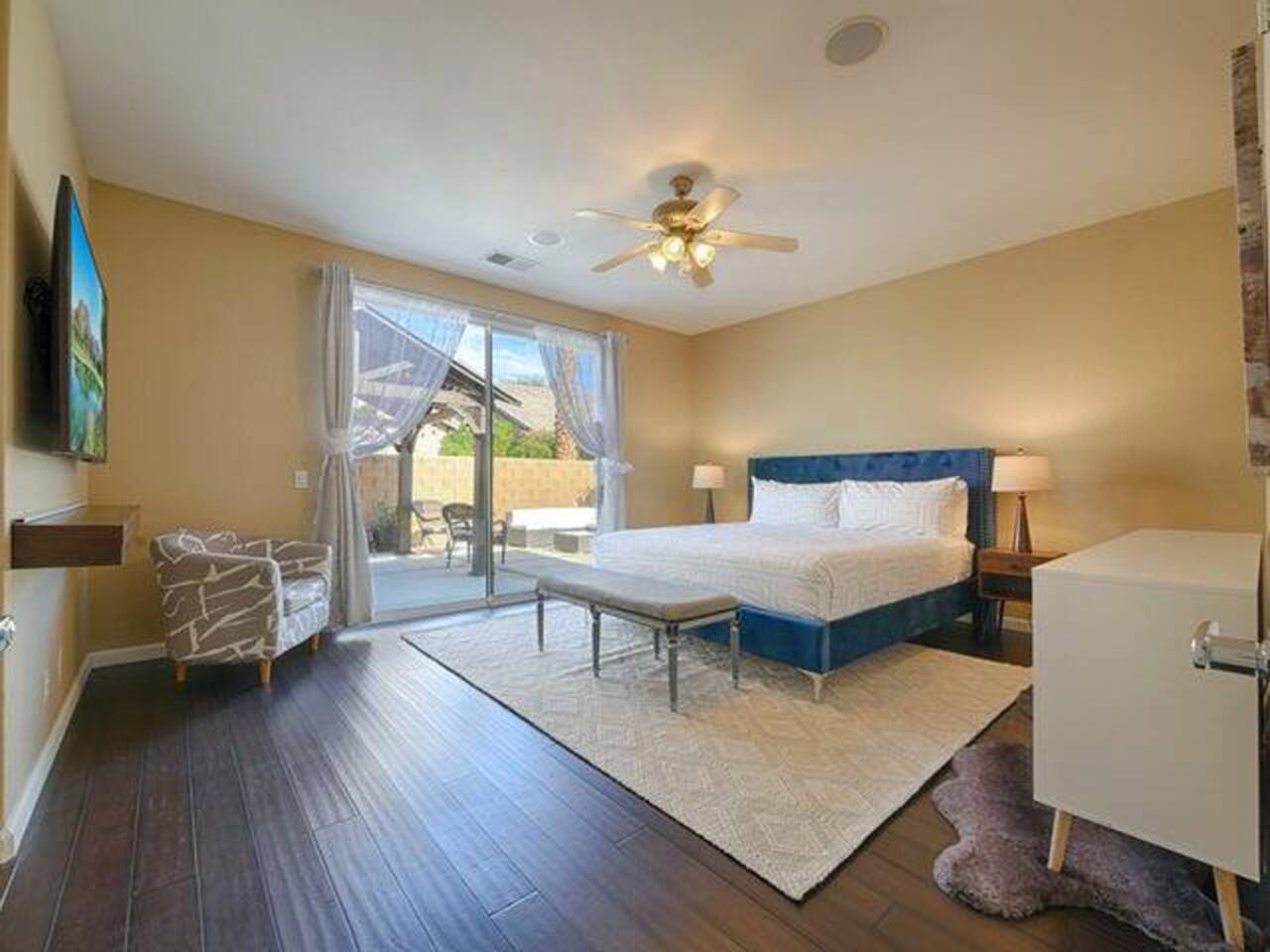 Tiki Boho is a Family friendly 4 Bedroom Villa - Sleeps 16 - located on border of La Quinta and Indio. Watch your favorite NFL Football Teams this season on our OUTDOOR FOOTBALL JUMBO SCREEN or entertain the kiddos with their favorite Disney+ shows while lounging in the Heated Pool and Spa! Mini Golf 12 holes and Tiki Bar with chairs and fire pit! Full Arcade with Legal size pool table, ping pong, hockey, foosball, roller ball, and Neon Theme! Enjoy with your family & friends located central to everything. Shops, Restaurants, Art fairs, Safari Park, Concerts, & Golf! Explore around Old Town La Quinta, visit hiking trails, take a drive to Joshua Tree and enjoy nature and trails. ALL BEDROOMS: 16 Capacity Bedroom 1: 2 Queen beds (4 people) and a trundle bed (2 people) - Very large room sleeps 6 Bedroom 2: Queen bed - sleeps 2 Bedroom 3: 1 Double Full bed/sleeps 2 - 1 Bunk Bed Twin Size/sleeps 2 Bedroom 4: Master Bedroom - 1 King bed/sleeps 2 - 1 Trundle Bed/sleeps 2 - 1 Crib Pack and Play IF NEEDED IN CLOSET: 1 Extra Twin Size Trundle with Mattress sleeps 1 TWO OUTDOOR LED TV JUMBO SCREEN AND PROJECTOR: We have 2 large 8x5 foot screens in the pool area and tiki bar area to enjoy with friends and family watching your favorite NFL Football teams, Baseball, Soccer, Tennis, Golf, and Hockey. Have the kids enjoy their favorite movies on Disney+ - YOU MUST HAVE YOUR OWN APP ACCOUNTS OR FIRE STICK 1. Projector has Netflix, Prime video, Disney+, YouTube, Hulu, and other apps 2. Can use Roku Fire Stick or Chromecast 3. Play Station hookups available on projector 4. High Def, USB and Bluetooth equipped - Please keep sound lower due to neighbors especially in the evening. 5. One Projector 1080P, 4K Projector Full HD with WIFI 6 and Bluetooth 5.2, Support 270° Rotatable 4 SMART TV's in Living Room, Bedroom 1 with 6 people, King Size Bedroom, and Master Bedroom 1GB Fast WIFI IN HOME WHAT ARE THE ACCOMODATIONS? Your vacation rental is completely furnished and well stocked with all major and small appliances, including a coffee maker, Keurig coffee bean grinder, blender, toaster, Crock pot, iron, ironing board, hair dryer... The kitchen is well equipped with all basic dining and serving essentials, including plates, bowls, silverware, cooking and grilling utensils, wine and drinking glasses, bar and wine accessories. If you find yourself in need of something, please contact me so I can accommodate your request. HOUSE SUPPLIES Your home will be stocked with an initial supply of trash bags, paper towels, toilet paper, kitchen cleaning supplies, laundry detergent, basic cooking spices, hand soap, his & her body wash, and shampoo & conditioner. Other items include pool towels for all guests. TRANSPORTATION Your vacation home is central to many attractions, including walking distance to Coachella Fairgrounds & Stagecoach, Polo fields, and biking distance to Old Town La Quinta. Included are four easy riding beach cruiser bicycles equipped with lights, helmets and locks, if you choose to take a stroll. Of course any ride share service (Uber & Lyft) and traditional transit services (Taxi & Bus) are always available too. If you drove or rented a car, you may park 2 car(s) in the garage and 2 in the driveway. Street parking is strictly monitored and enforced to 2 cars. If you plan on attending the music festivals, there is a shuttle service close by, or you may opt to rent bikes or use a ride share service. LOCATION Minutes from the Coachella Festivals, Indian Wells Tennis Gardens, Empire Polo Fields, Old Town La Quinta and many golf courses. Hwy 111 is just down the street 2 blocks with Costco, Target, Starbucks, Coffee Bean & Tea, Super Walmart, and many other chain and local stores. Dining options are abundant and close. Just minutes from I-10, you can quickly head to Palm Springs and many valley casinos and other Coachella Valley destinations. ESTIMATED DISTANCE FROM YOUR VACATION HOME •Coachella Festivals - 2 miles (2-3 Minutes Driving) •Indian Wells Tennis Garden: 2 miles (2-3 minutes Driving) •Empire Polo Fields: 4 miles (2-3 minutes Driving) •Old Town La Quinta: 4.4 miles (5 minutes Driving) •Palm Springs International Airport: 19 miles (24 minutes Driving) •Joshua Tree National Park: 55 miles (53 minutes Driving) LOCAL ORDINANCE / GOOD NEIGHBOR POLICY I encourage you to enjoy my property; however, if there is a noise complaint and the sheriff responds you will receive a fine from $500-$5000 from the City of Indio, followed by a possible eviction in egregious circumstances. Guests will not be issued a refund for issues related to a noise ordinance violation. It is important to respect the quiet enjoyment of neighbors. There is a mandatory 10% City of Indio Transient Occupancy Tax (TOT) added to your stay, which may have been collected at time of reservation. GUEST ACCESS You will have full access to the entire house and backyard with extreme privacy! CHILDREN & POOL NOTE: There is no lifeguard on site and there is no safety pool fence around pool. There are two exterior access doors equipped with door breach alarms connected to the house alarm that will chime every time the doors are opened (back patio door & master bedroom slider). WALK WALK TO COACHELLA AND STAGECOACH: A short 9 min walk to Festivals or bike ride. Guests have read and understand that their children(s) safety is their priority and they are responsible for proper adult supervision. There is no diving allowed into the pool or spa. This pool is only 5-6 feet in depth and diving is extremely dangerous and could lead to serious injury or death. House Rules: Please follow our rules and respect the home 1. No smoking of cigarettes, vape, weed or any other drugs inside home. Any smoking products or smell will be a fine to guests for disobeying house rules. 2. No glass around pool or in pool. Broken glass found will be fined. 3. No graffiti in back yard or pool - $500 fine 4. Quiet hours in home and outside on backyard/patios - Must b