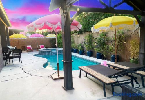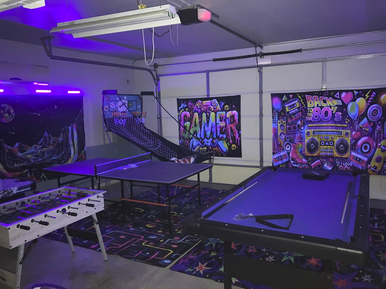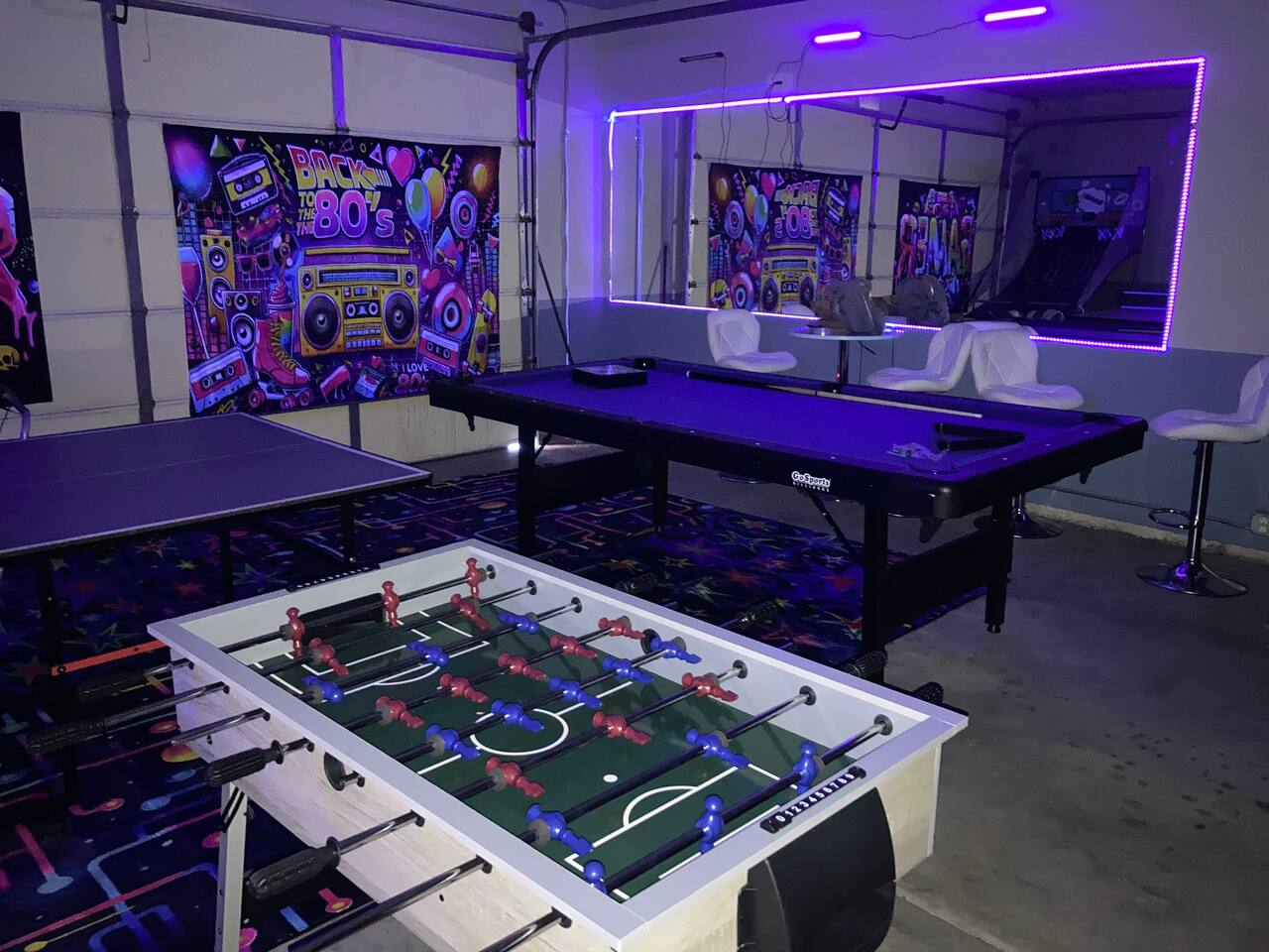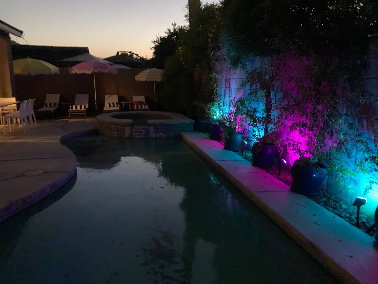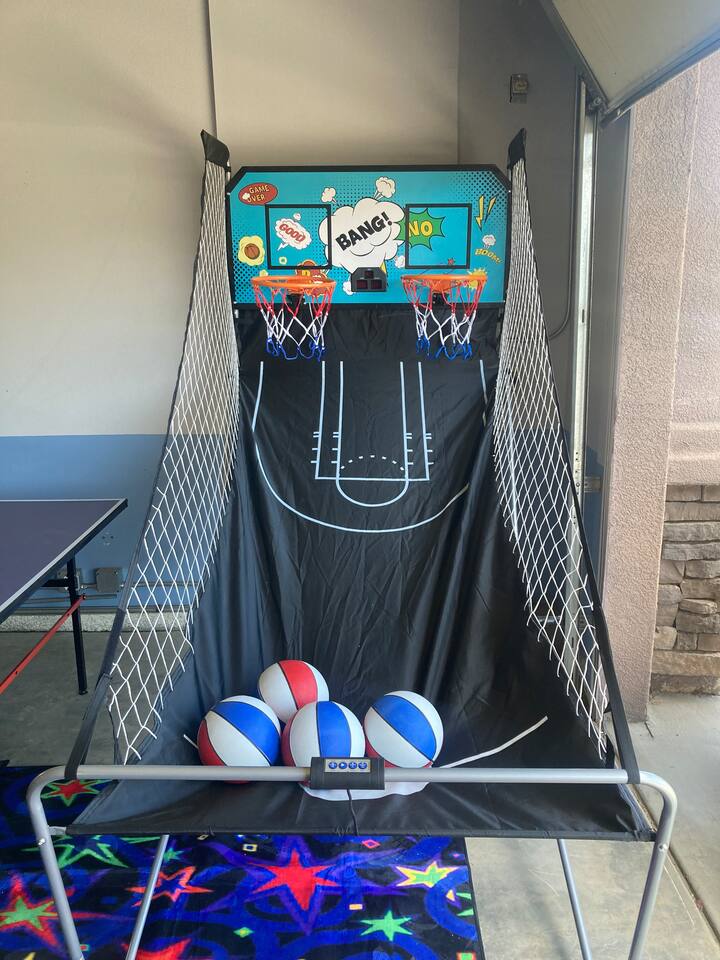 Enjoy this family-friendly retreat sleeping up to 16 guests. Relax in the outdoor pool and heated spa, watch the movies on our outdoor Jumbo Screens, play 12-hole mini golf, or unwind at the Tiki Bar with chairs and a fire pit. Have fun in the full arcade with a pool table, ping pong, air hockey, foosball, and a neon glow party. Explore Old Town La Quinta, hike scenic trails, or take a drive to Joshua Tree. A fantastic getaway for friends and family to create unforgettable memories!